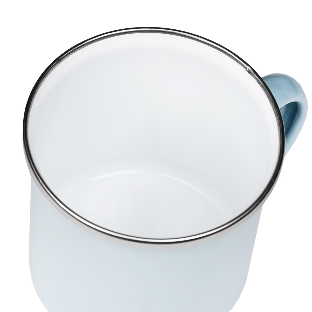 Smaltovaný plechový hrneček s nerezovým lemem, o průměru 79 mm a objemu 330 ml potěší každého dobrodruha.